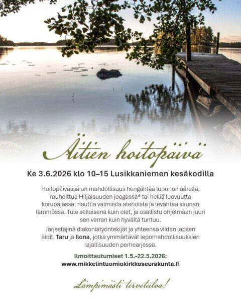 Äitien hoitopäivä klo 10-15 LusikkaniemessäWhen 3.6.2026 10:00 - 15:00 Add To Calendar Download ICS Google Calendar iCalendar Office 365 Outlook Live