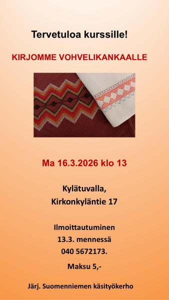 Käsityökerhossa kirjontaa vohvelikankaalle klo 13 KylätuvallaWhen 16.3.2026 13:00 - 14:30 Add To Calendar Download ICS Google Calendar iCalendar Office 365 Outlook Live